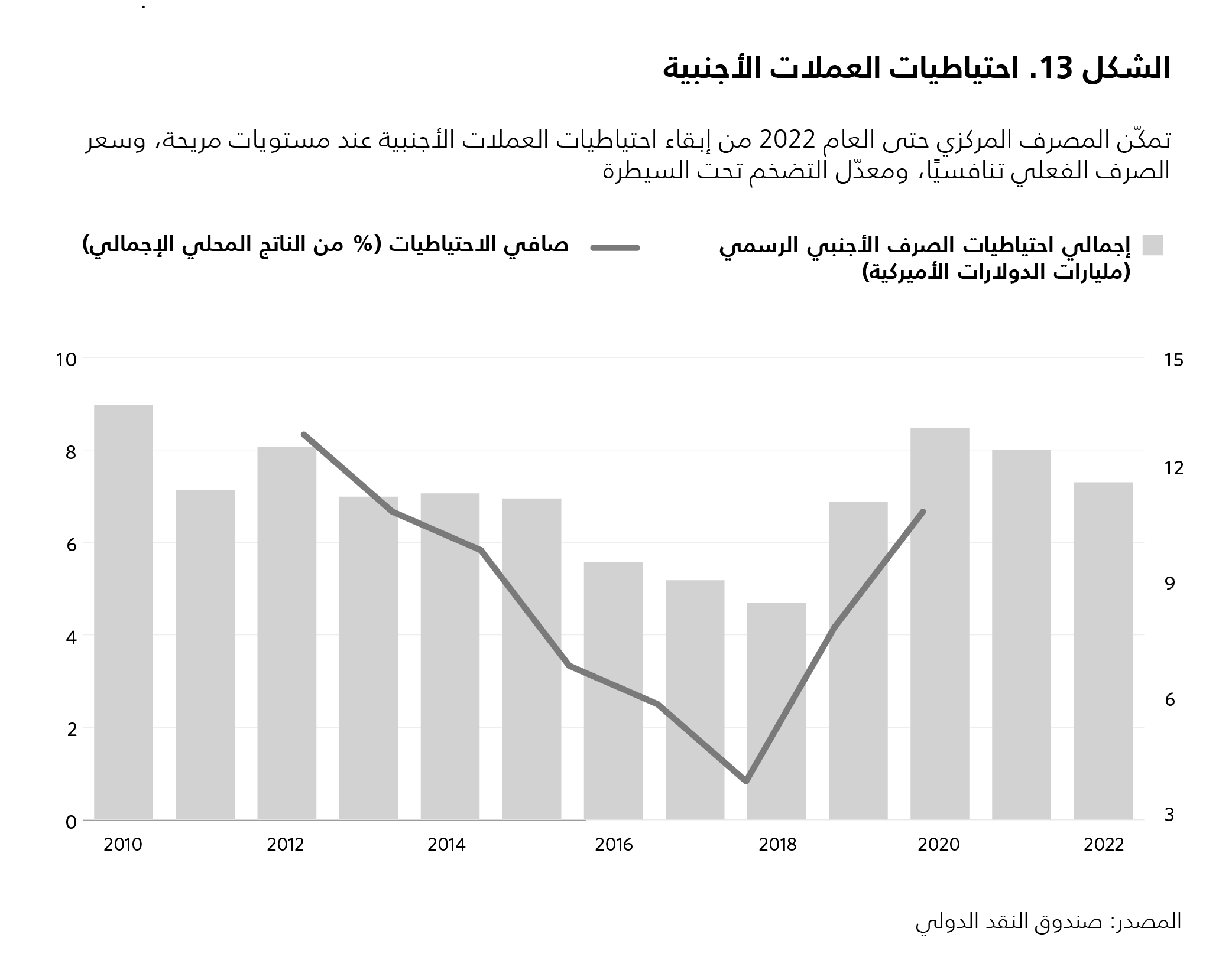 أدّى تراجع الرصيد الخارجي إلى انخفاض مطّرد في احتياطيات العملات الأجنبية بين العامَين 2012 و2018، ما ألقى بضغوط على تونس لإجراء بعض التعديلات وإعادة تكوين الاحتياطي (انظر الشكل 13). فبعدما بلغت احتياطياتها من العملات الأجنبية أعلى مستوياتها على الإطلاق عند 8 مليارات دولار أميركي في العام 2020، بدأت بالتراجع في مطلع العام 2023، وانخفضت إلى 7 مليارات دولار بحلول نهاية الربع الثاني من العام نفسه، في انخفاض قدره 5.5 في المئة على أساس سنوي. وقد بلغت احتياطيات العملات الأجنبية نحو 8 مليارات دولار في كانون الأول/ديسمبر 2023.
