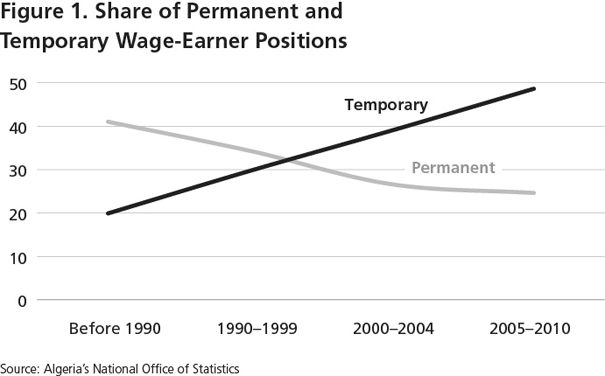 There has been a decline in unemployment in the last decade, but it has gone hand in hand with a growing preponderance of underemployment, temporary jobs, and informal-sector activities. As the official unemployment rate dropped from 30 to roughly 10 percent over the last decade, the share of temporary jobs increased. Fifty percent of jobs created during the period 2005–2010 were temporary, compared to 30 percent of the jobs created during the 1990s and 20 percent before the 1990s (see figure 1). Two factors help explain this development. The first is the emergence of a large number of micro- and small enterprises (with fewer than ten employees). The second is the declining government role in job creation. The Algerian public sector (government and state-owned enterprises) provided two-thirds of total employment until the early 1980s. When this figure declined as a result of the shift toward a market-oriented economy and the downsizing of public sector employment, a large number of job seekers have had to create their own employment or accept temporary positions in the informal sector.