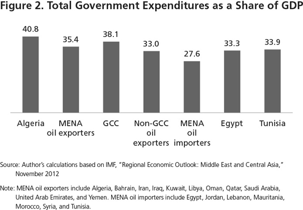 The share of the government total expenditure in GDP, which stood at 40.8 percent during the period 2009–2012, was much higher in Algeria than in other country groups in the region, including Middle Eastern and North African oil exporters or even members of the Gulf Cooperation Council (GCC) (see figure 2). In 2011, Algeria’s government spending jumped by 50 percent, and civil servants’ salaries grew by 46 percent.16