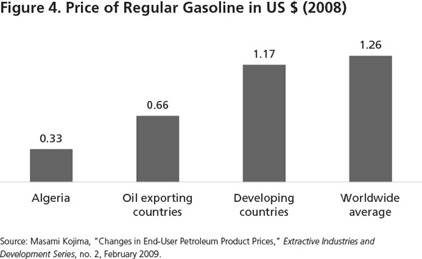 The Algerian regime also spends a significant amount of its hydrocarbon revenues on subsidies. Underwriting basic necessities, excluding oil and gas, costs the government $3.8 billion each year,19 which is equivalent to 6 percent of the government budget or 2 percent of GDP. Moreover, the low-priced energy that Algerian consumers enjoy costs the government the equivalent of 6.6 percent of GDP and 20 percent of public spending.20 This cost is often overlooked in public accounts as no explicit government transfer is made. But Sonatrach sells petroleum products on the domestic market far below international prices. The price of regular gasoline in Algeria represents half the average price in other oil-exporting countries, 28 percent of the average price in developing countries, almost one-quarter of the worldwide average price, and less than a quarter of the average price on international markets (see figure 4). This involves an implicit subsidy from the government to the final consumer that does not appear either on the state oil company’s records or in the state budget. This revenue could have been used by the government to reduce the budget deficit, increase spending in more productive areas such as infrastructure, education, and health, or provide welfare payments to poor people.