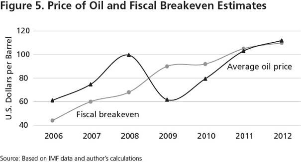 Already, Algeria’s public spending has risen so substantially since the eruption of the Arab uprisings as to push up the fiscal breakeven oil price, or the oil price required to balance the government’s budget. That breakeven price edged upward from around $73 per barrel in 2008 to more than $110 per barrel in 2012 (see figure 5).32 With the average price of oil hovering around $100 per barrel, the government is tapping the country’s sovereign wealth fund, known as the Revenue Stabilization Fund, to maintain the current pace of spending.33 The fund, which is a government subaccount at the central bank, collects oil-tax surpluses that are calculated on the basis of the difference between the oil price on the international market and a reference price of $37 per barrel. The government transfers any surplus to the fund and withdraws from it to finance budget deficits in case oil-tax revenues are insufficient.
