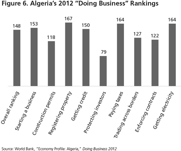 Despite its market of 37 million consumers, Algeria’s poor business environment and the instability of its laws and regulations on investment make it somewhat unattractive to foreign investors. Most small- and medium-size private enterprises suffer from entry barriers, limited access to bank funding, and a legal environment unfriendly to competition. As a result, both domestic and foreign investors are deterred from launching industrial and services projects that could strengthen Algeria’s economy and improve its competitiveness. According to the World Bank’s Doing Business 2012 report, which ranks countries based on the ease of doing business with them, Algeria ranks 148 of 183 states—behind most Middle Eastern and North African countries37—and has been losing ground (see figure 6).