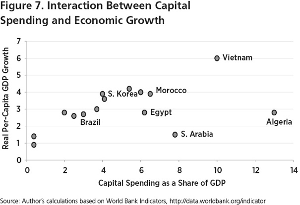 Algeria’s economic growth suffers as a result of its unattractive business climate. Although public investment has been more than twice that of neighboring countries such as Morocco and Tunisia over the past half-dozen years, Algeria has not achieved the same level of economic growth as its neighbors. Indeed, compared with a sample of countries in the Middle East, Africa, Asia, and Latin America, Algeria emerges as an outlier that combines an abnormally high level of public spending with mediocre economic growth (see figure 7).