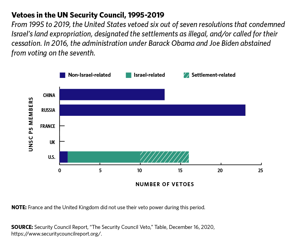 In the past, the United States has blocked UN resolutions with broad consensus supporting Palestinian human rights; cut off funds to the UN Educational, Scientific and Cultural Organization for admitting Palestine as a member; conditioned contributions to multilateral bodies because of activities related to positions on the Israeli-Palestinian issue or quit those bodies entirely;32 attempted to prevent the creation of a UN database of settlement enterprises;33 and sought to discourage the EU and Ireland from labeling settlement products or prohibiting their importation. The Trump administration’s imposition of sanctions against the prosecutor and judges of the International Criminal Court for targeting American or Israeli individuals accused of war crimes is the most egregious example to date of a misuse of power to prevent accountability.34