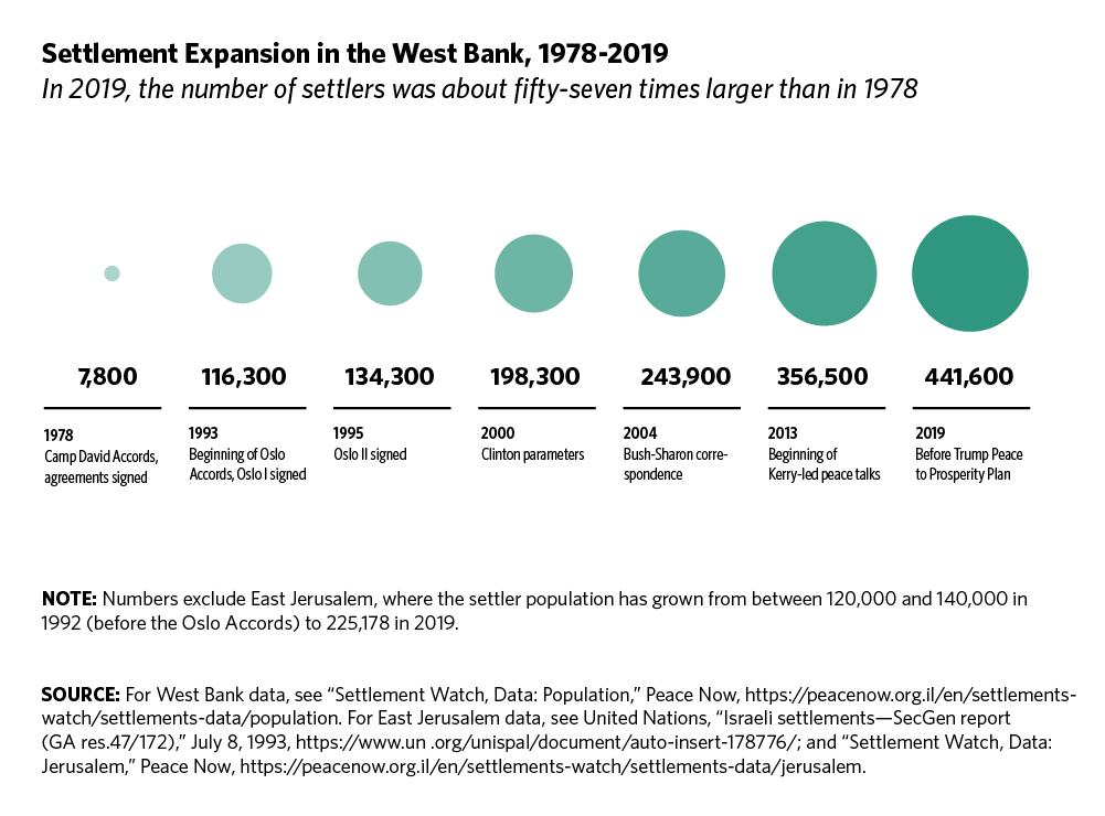 20 “Settlement Watch, Data: Population,” Peace Now, https://peacenow.org.il/en/settlements-watch/settlements-data/population; and “Settlement Watch, Data: Jerusalem,” Peace Now, https://peacenow.org.il/en/settlements-watch/settlements-data/jerusalem.