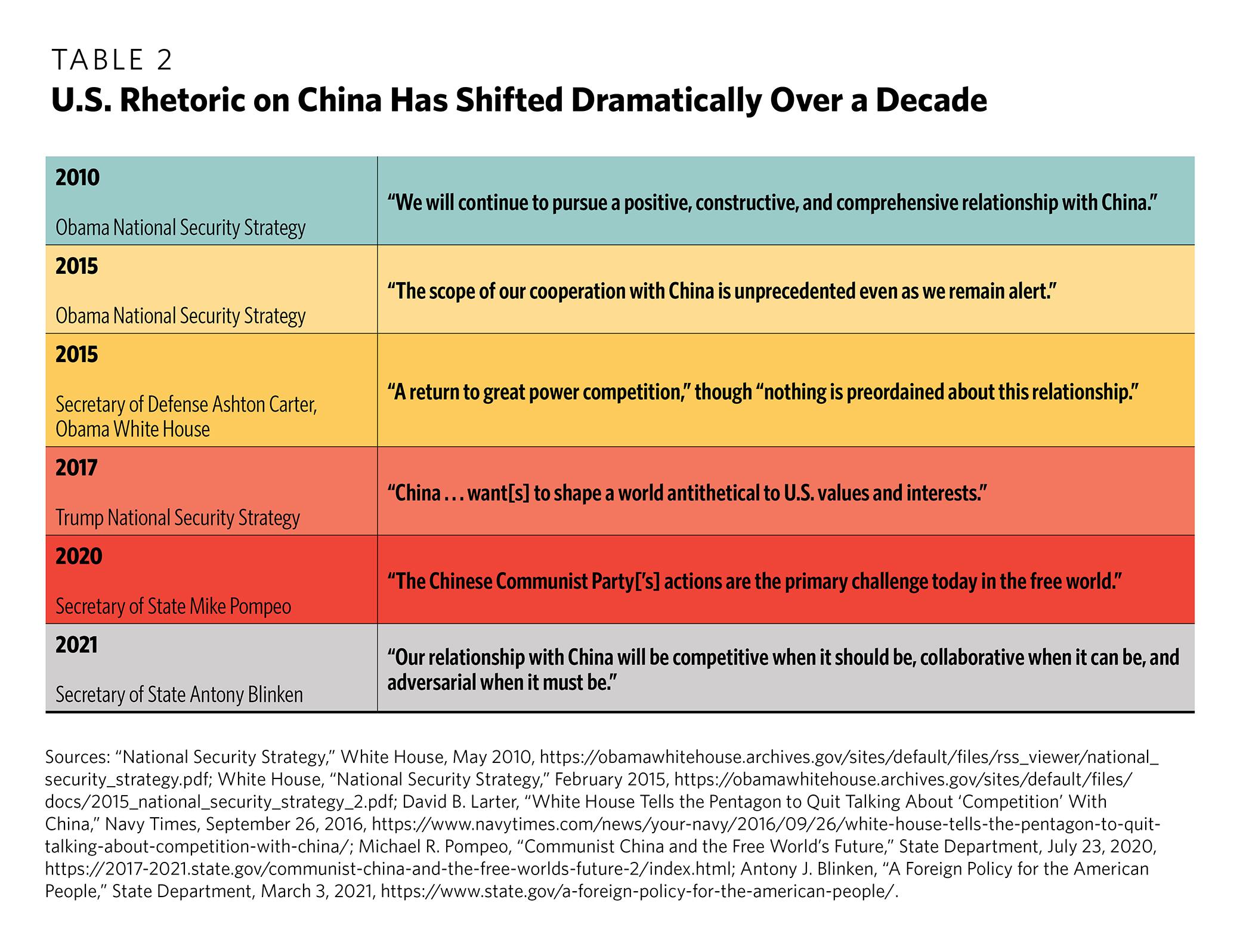 This official consensus, never without dissenters, eroded and eventually collapsed during the Obama administration. Major catalysts included China’s militarization of disputed islands and broader military buildup; its unrelenting intellectual property theft and exploitation of international trade rules to move up the economic value chain; its deepening authoritarianism and abhorrent repression of Uyghurs and other minority groups; and its bolder encroachments on Hong Kong and Taiwan.3 Across the board, China seemed increasingly intent on and capable of challenging U.S. interests, values, and visions of global order. These developments caused a sea change in U.S. thinking on China. Within a few short years, cautious optimism or ambivalence turned into distress and fear, and most U.S. policymakers came to identify Beijing as America’s primary long-term state threat (see Table 2). As a result, U.S. leaders belatedly started to scrutinize the many ways their country had become dependent on or supportive of China in prior decades—with technology rightly emerging as a central concern.
