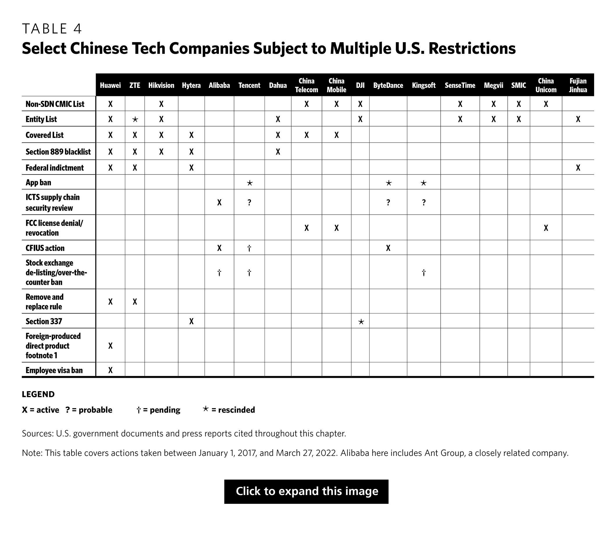 There are many kinds of defensive tools, and U.S. policymakers must have a firm grasp of their differences (see Table 3). Defensive tools are often described generically as “sanctions” or “blacklists,” but this conflates distinct legal authorities with a range of effects and implementing agencies. For example, SenseTime and Hytera are among the Chinese tech firms most targeted by U.S. controls, yet the restrictions imposed on each company do not overlap at all. Huawei, meanwhile, suffers from nearly all of the controls placed on both SenseTime and Hytera, plus others that are completely unique (see Table 4 at the end of the chapter).